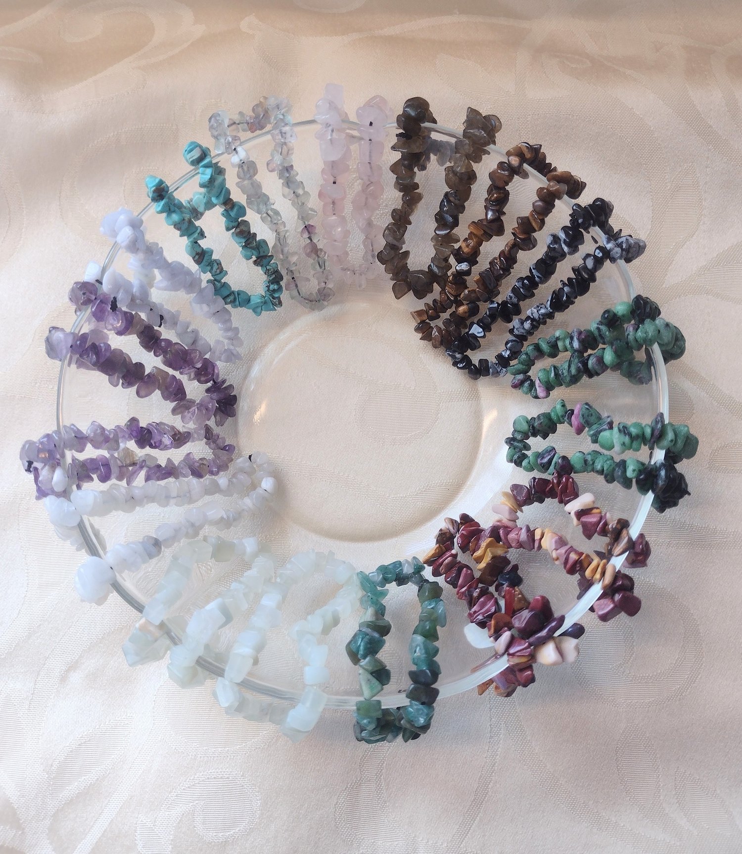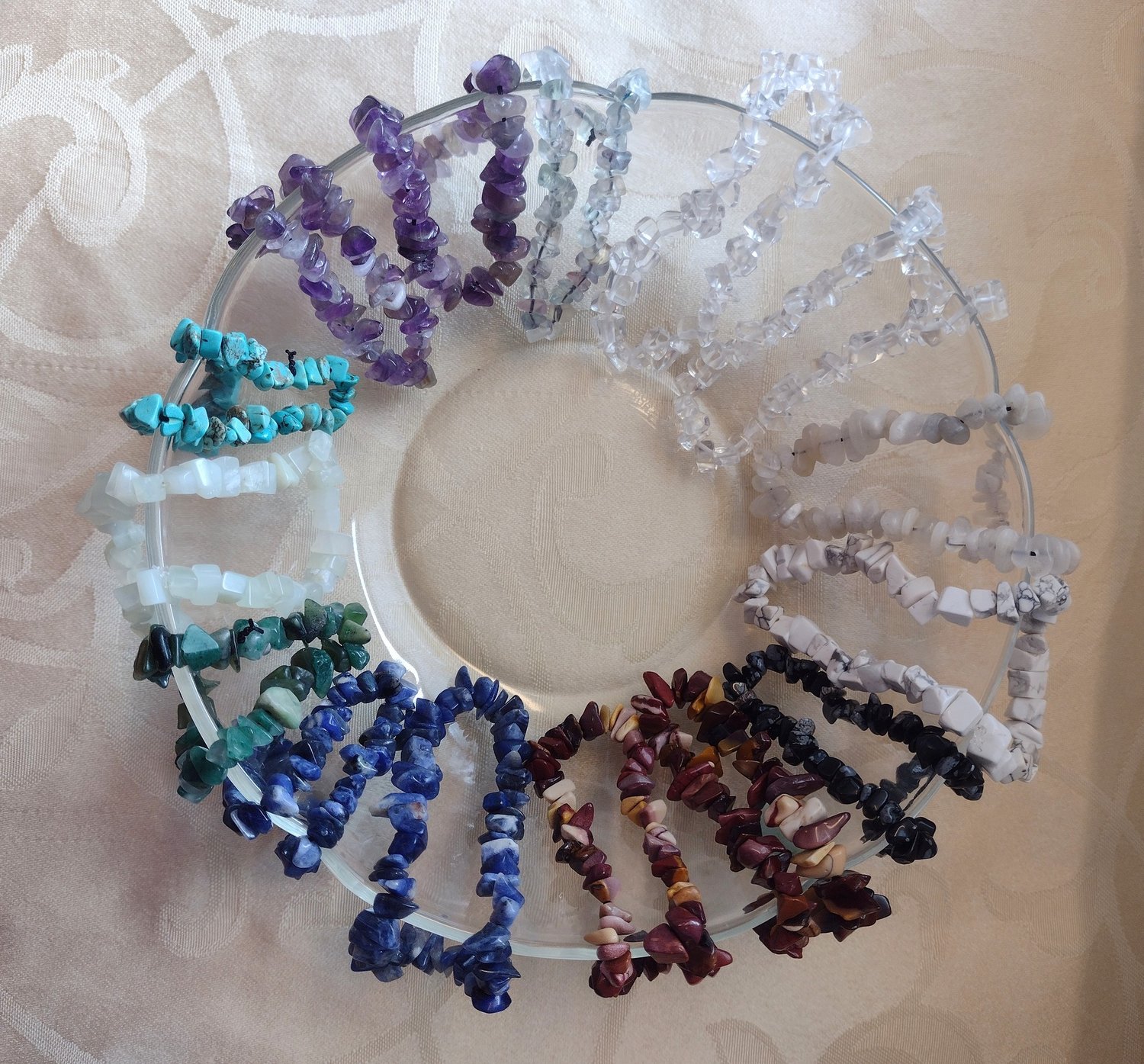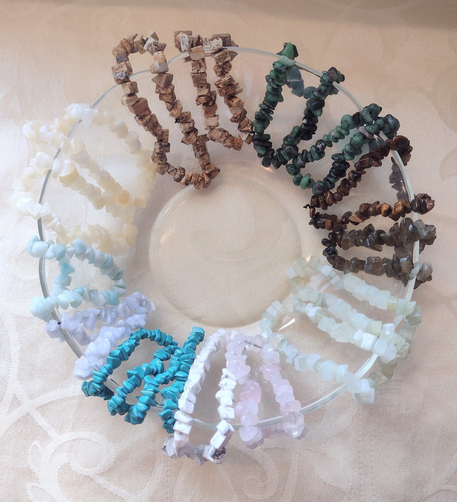 Many different types of stones, most are around 7" for size, some larger, some smaller, tell me what size you need, tell me which stone; the bracelet is stretchy.