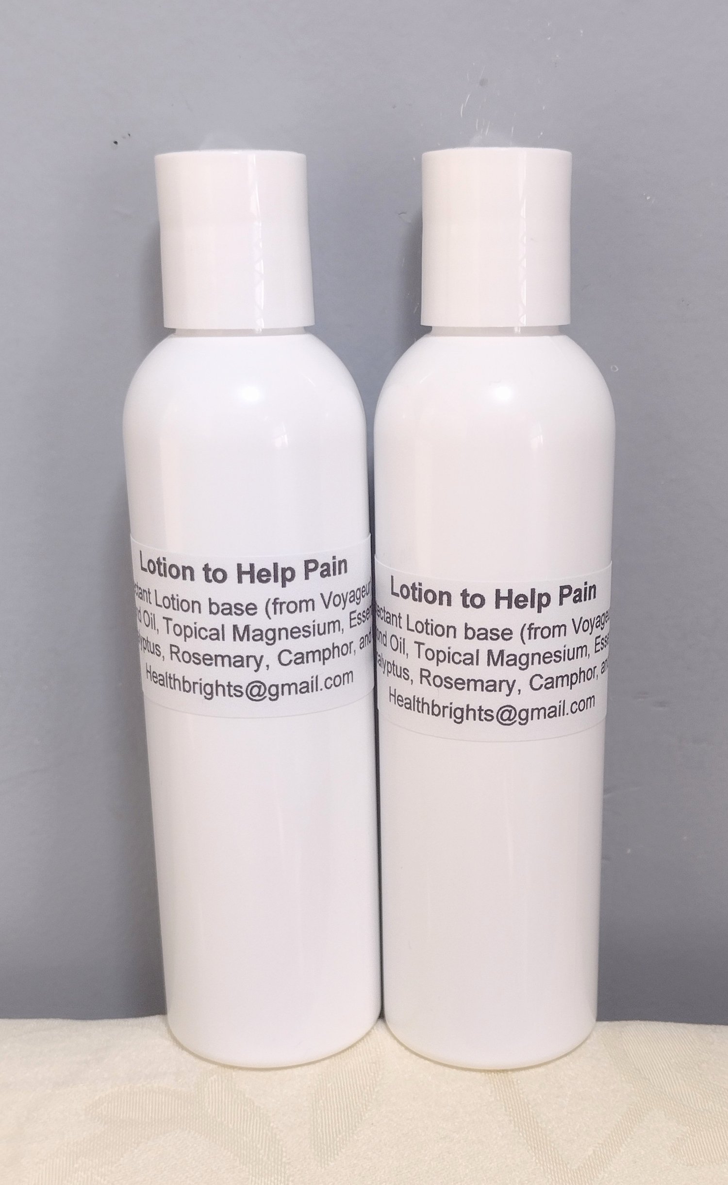 Ingredients: MSM Lotion Base, Arnica Oil (base of Almond Oil), Topical Magnesium, Essential Oil Blend: Eucalyptus, Rosemary, Camphor, Cajeput and Grapefruit Seed Extract.