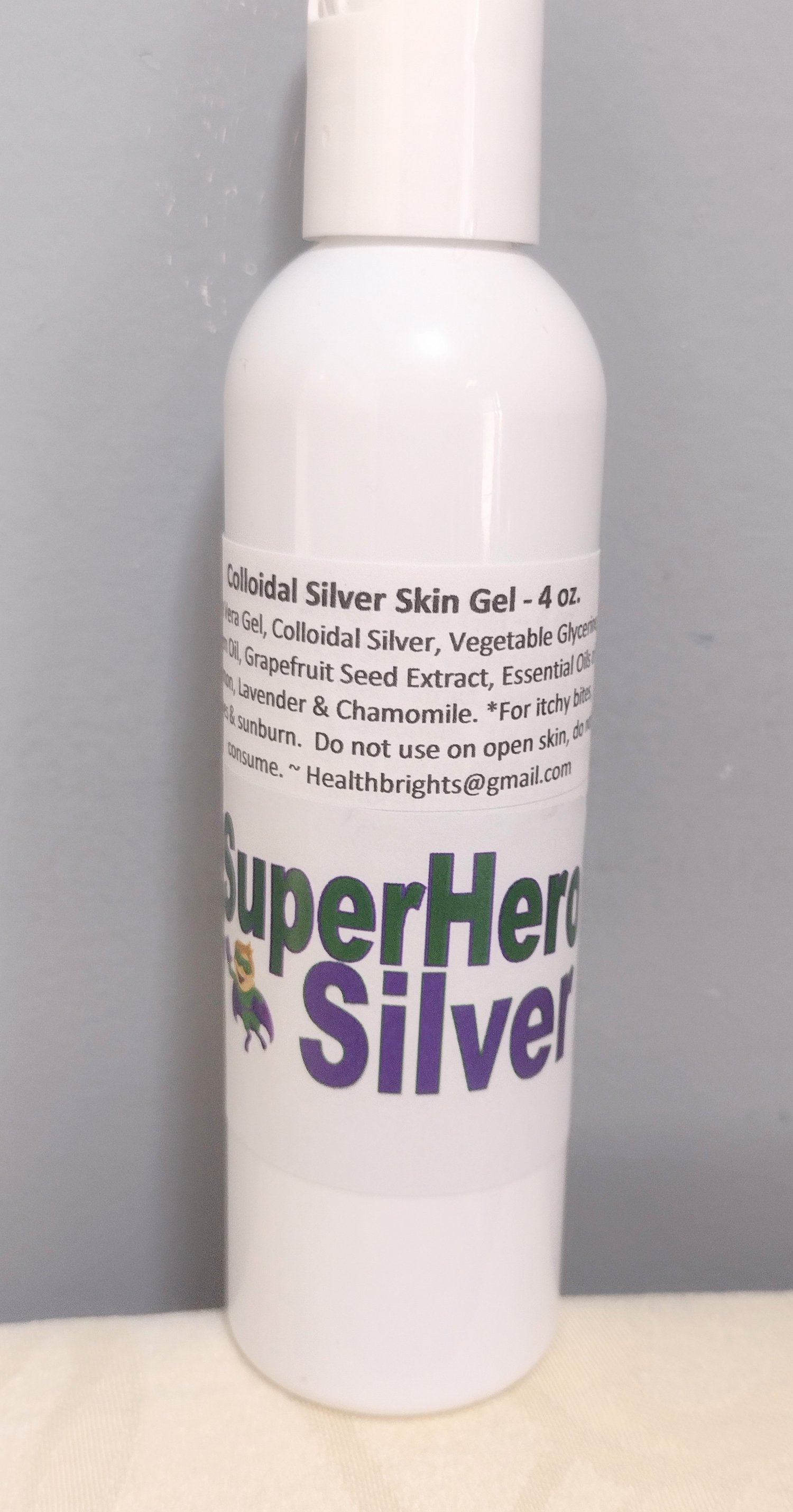 Ingredients: Aloe Vera Gel, Colloidal Silver, Vegetable Glycerin, Neem Oil, Grapefruit seed extract, essential oils of Lemon, Lavender and Chamomile.